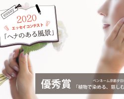 (受賞者のコメント) たまたま締切直前に御社のホームページにたどり着き、参加することが叶いました。 言葉にすることで、周りの人への感謝の気持ちが湧き上がり、間接的にヘナに癒やされるような気持ちになりました。 このような機会がなければ書かなかった文章だと思うので、参加させていただけて本当に良かったです。