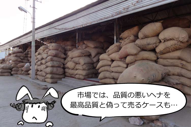 インドのヘナ市場には沢山のヘナが積まれますが、下の方に積んである売れ残りのヘナほど品質が悪く、ニオイが強いようです。