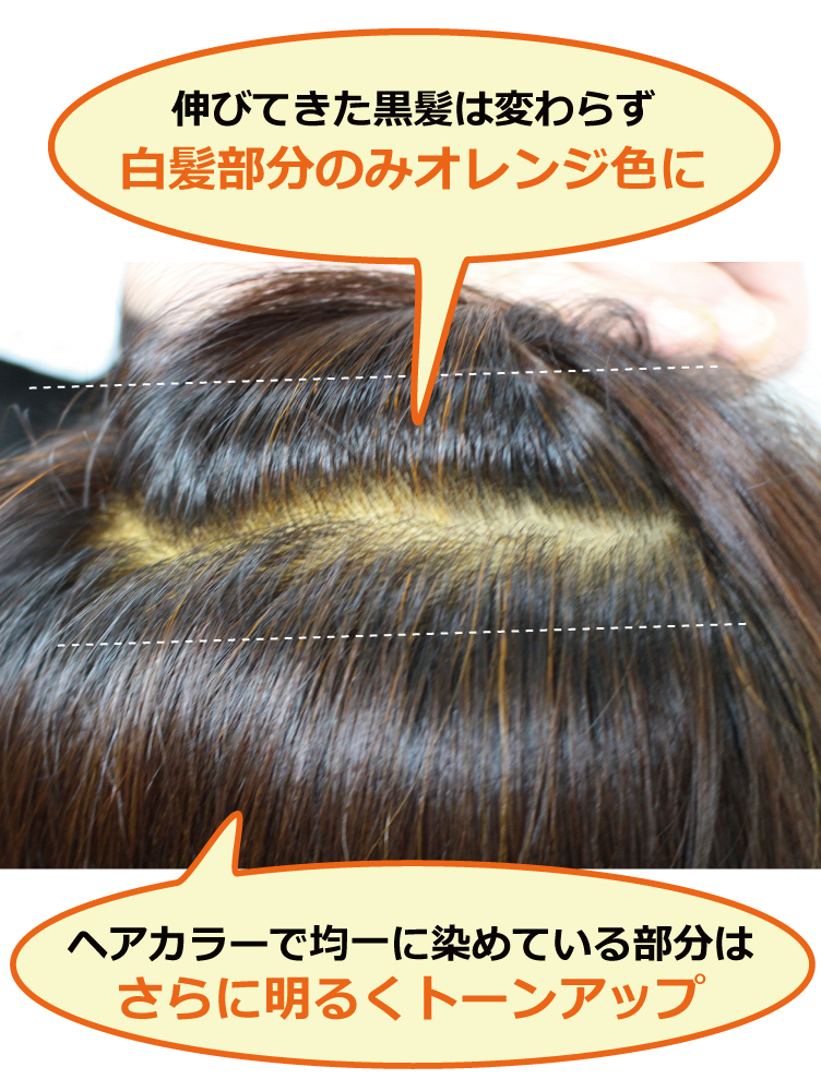 黒髪は変わらないか、陽に透かした時にほんのりトーンアップします。白髪がある場合は、その部分だけがメッシュ状に濃いオレンジ色に染まり、黒髪にまぎれて目立たなくなります。