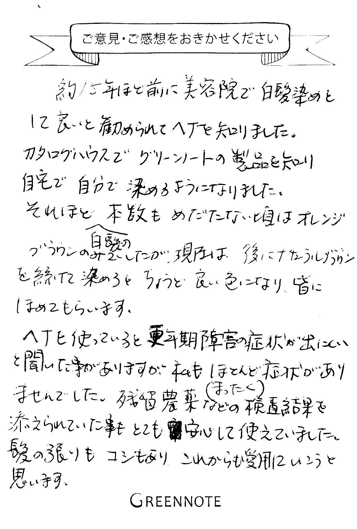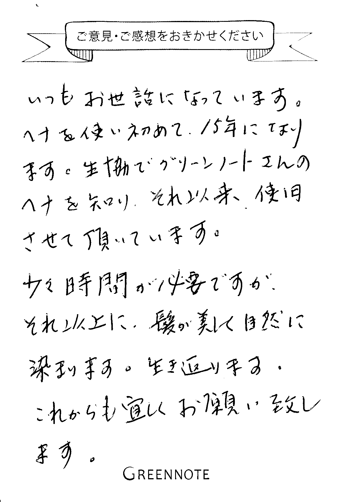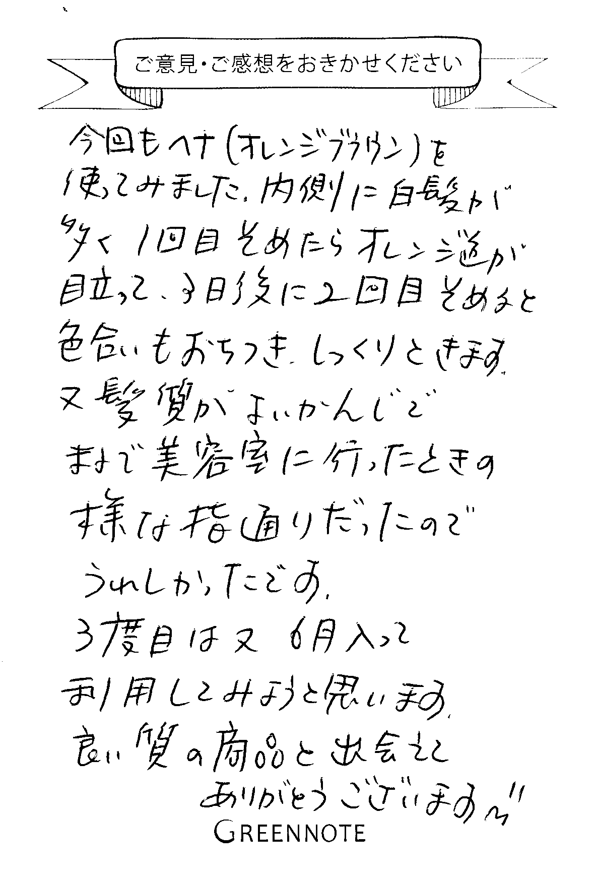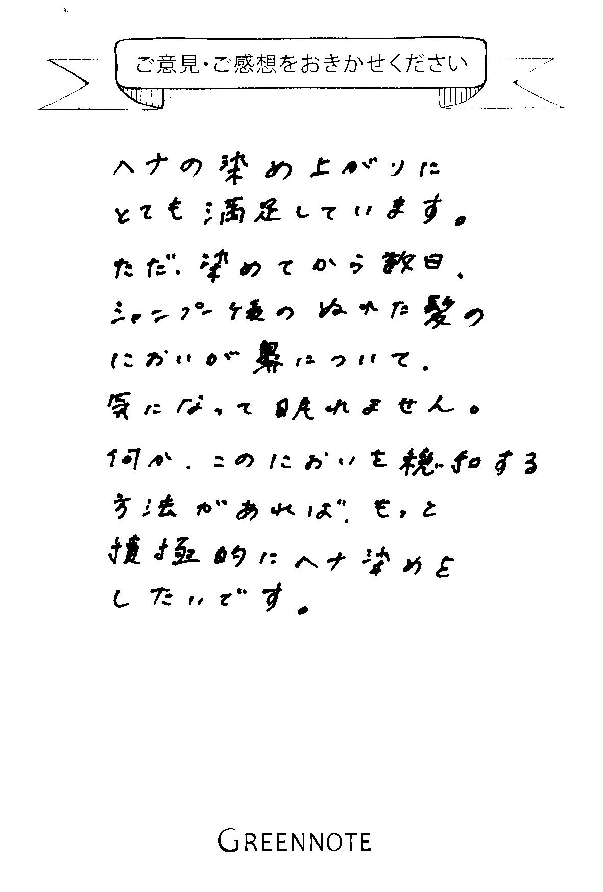 グリーンノートヘナを使った方たちのお声を紹介します。良かったお声も、ここは残念というお声も、どれも大切なお声として、わたしたちスタッフの励みと課題になっています。これから使いたいと思っている方は、ぜひ参考になさってください。