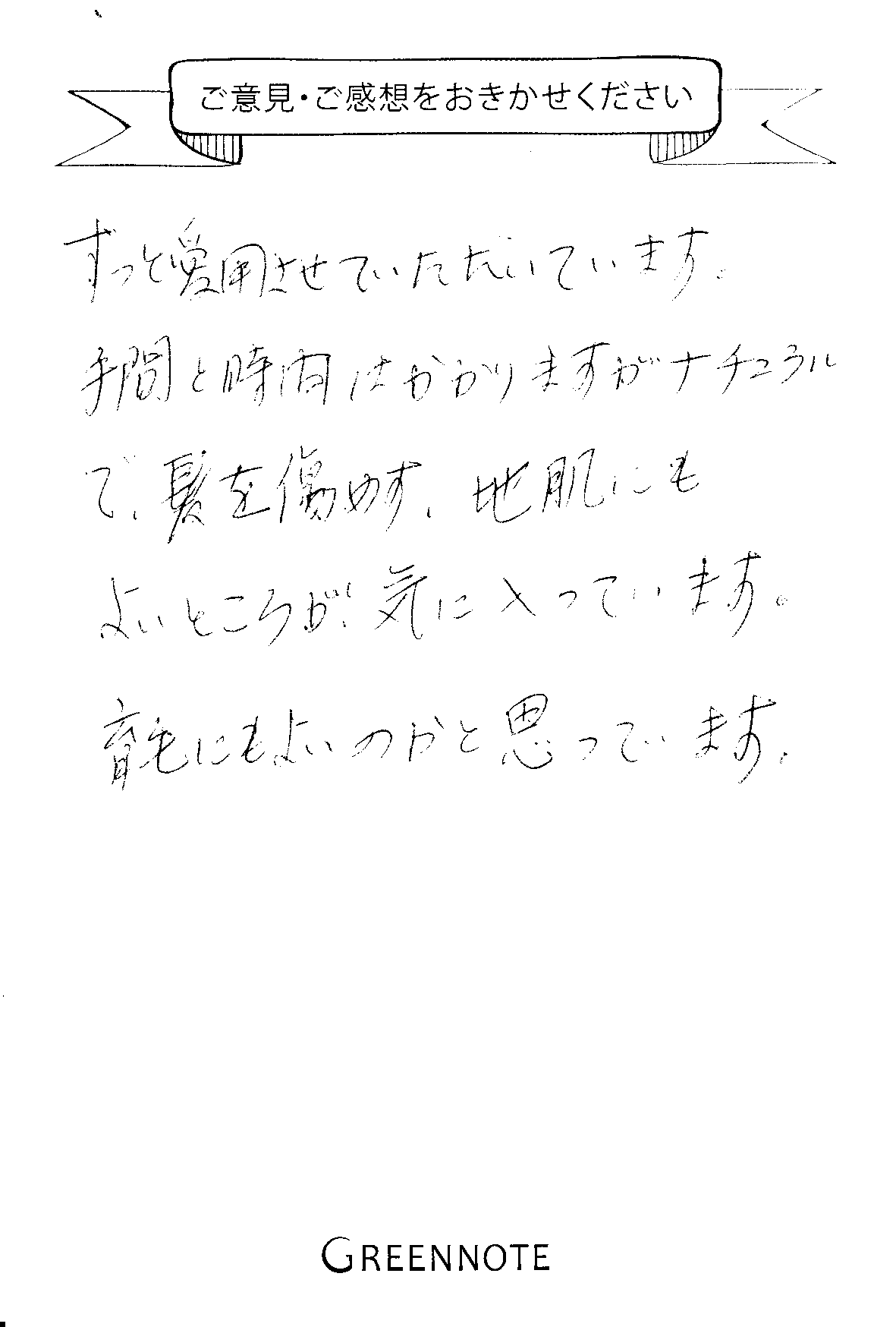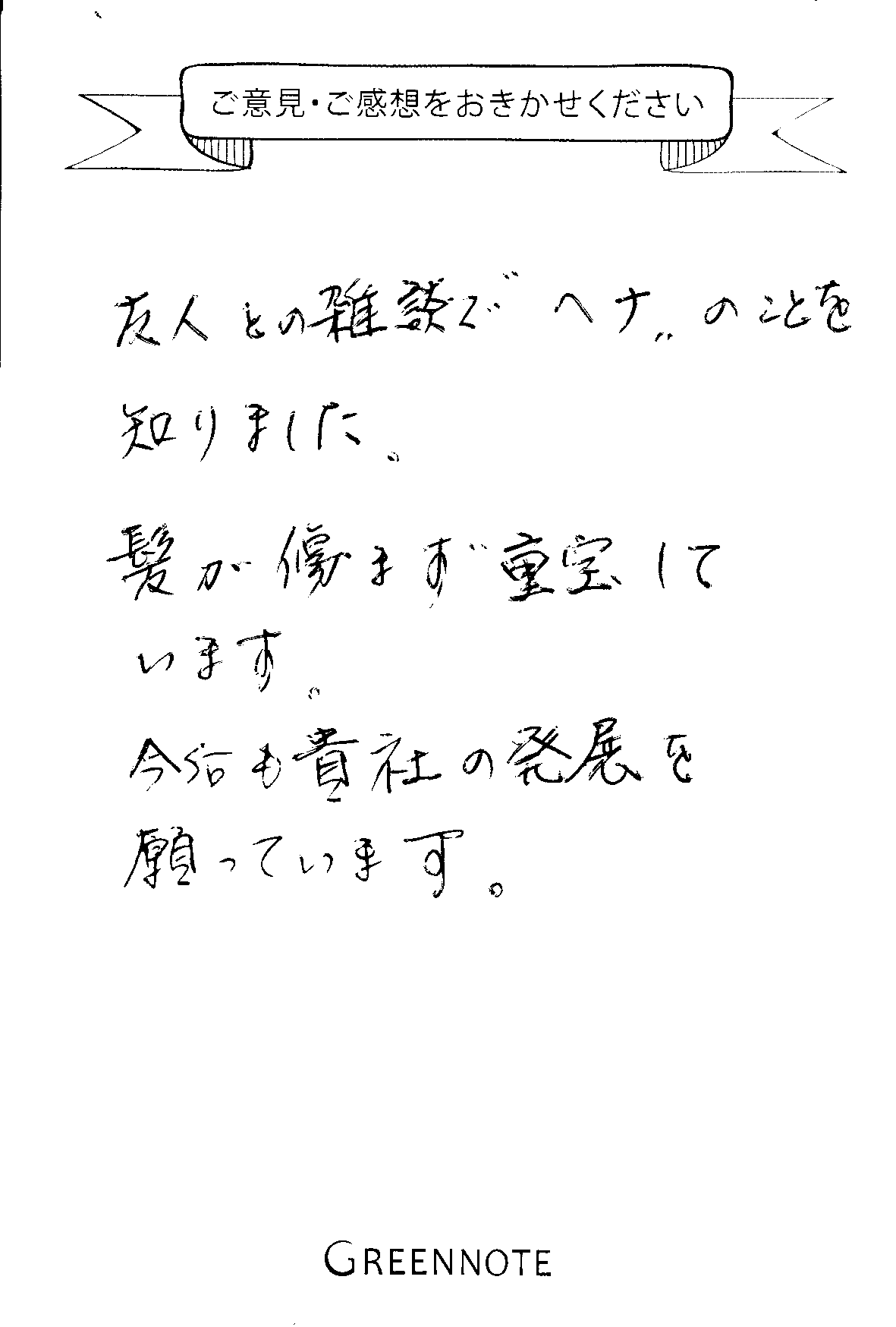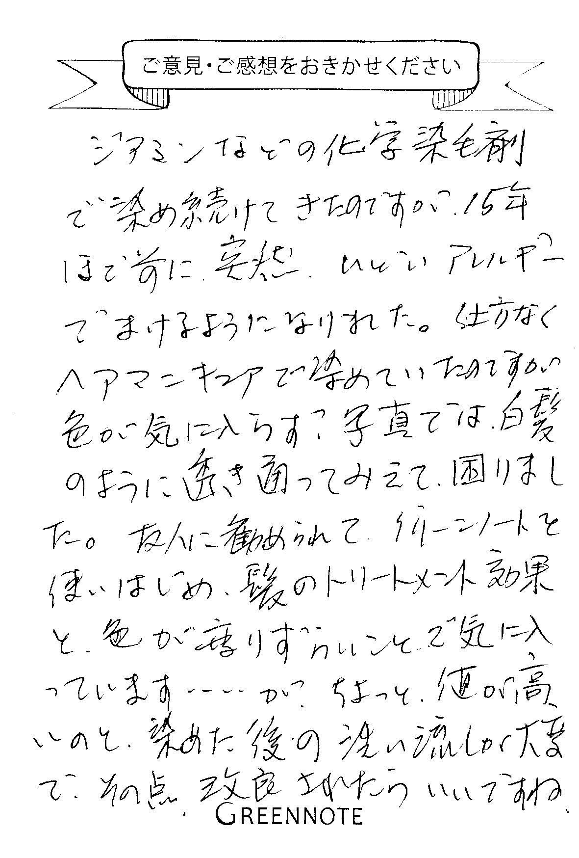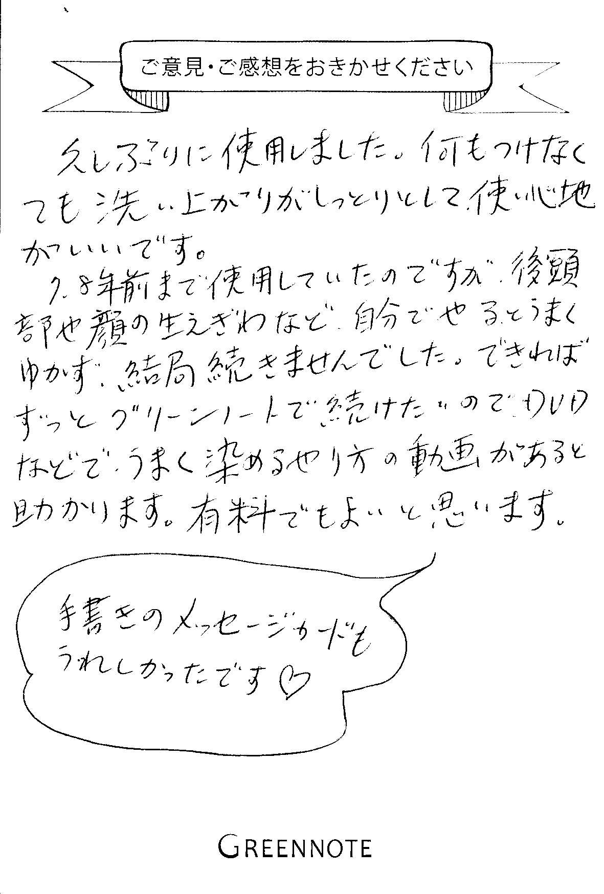 グリーンノートヘナを使った方たちのお声を紹介します。良かったお声も、ここは残念というお声も、どれも大切なお声として、わたしたちスタッフの励みと課題になっています。これから使いたいと思っている方は、ぜひ参考になさってください。