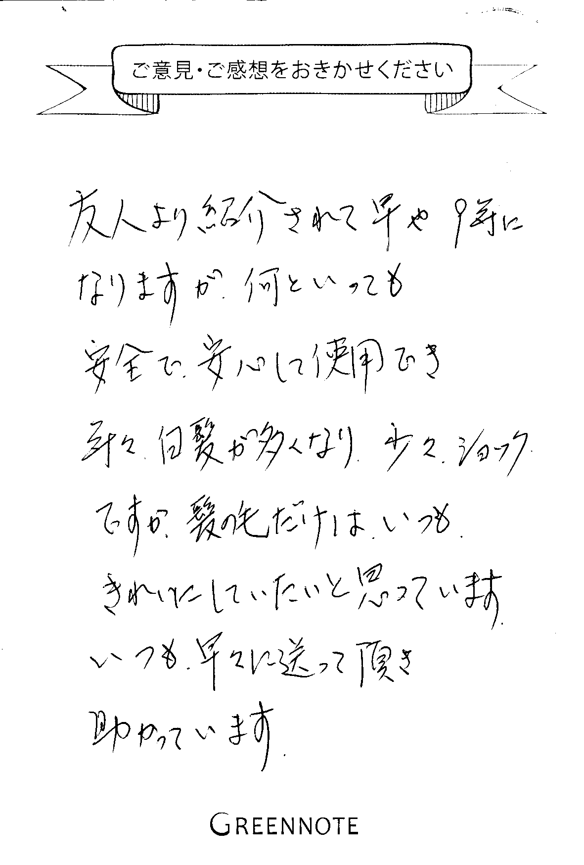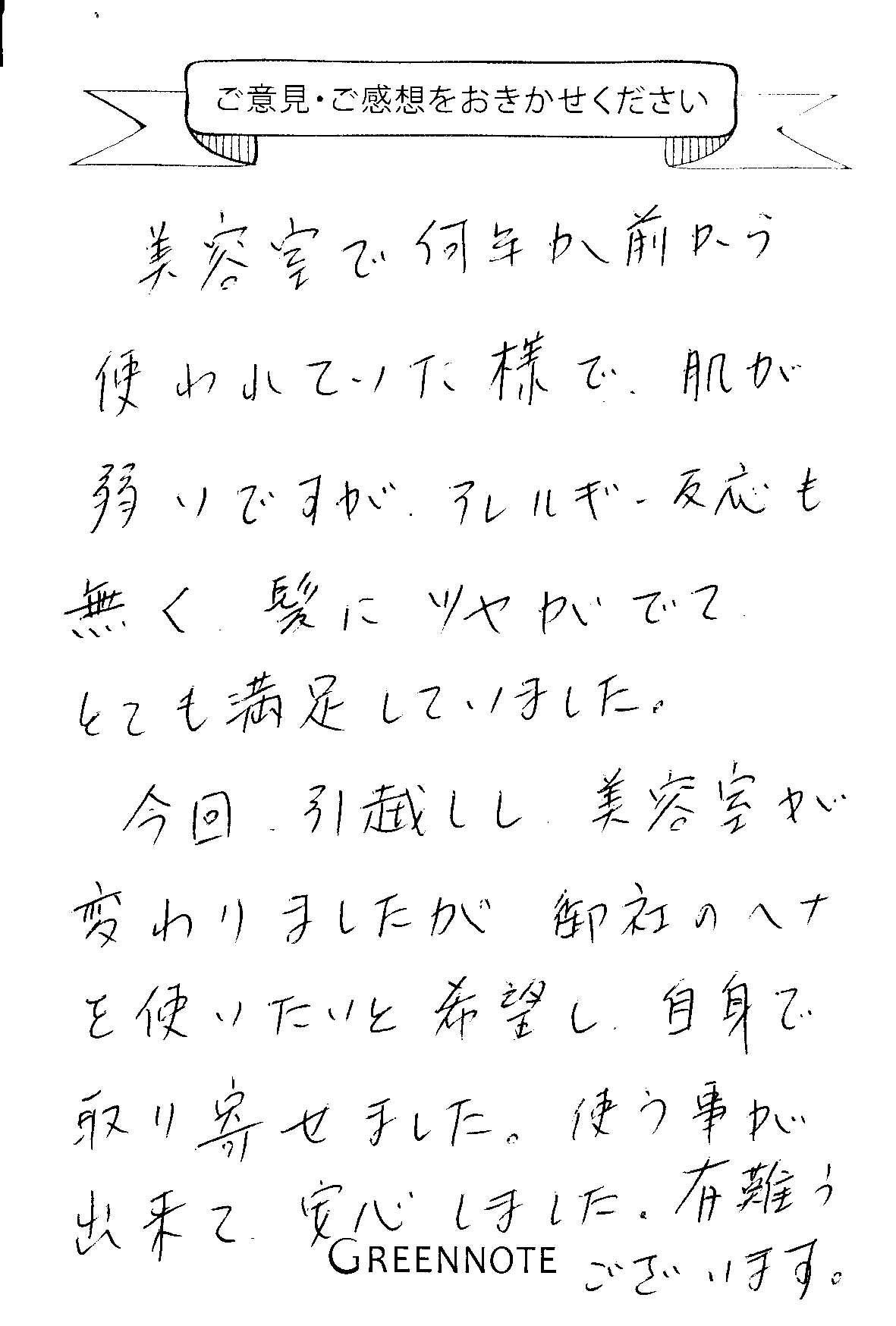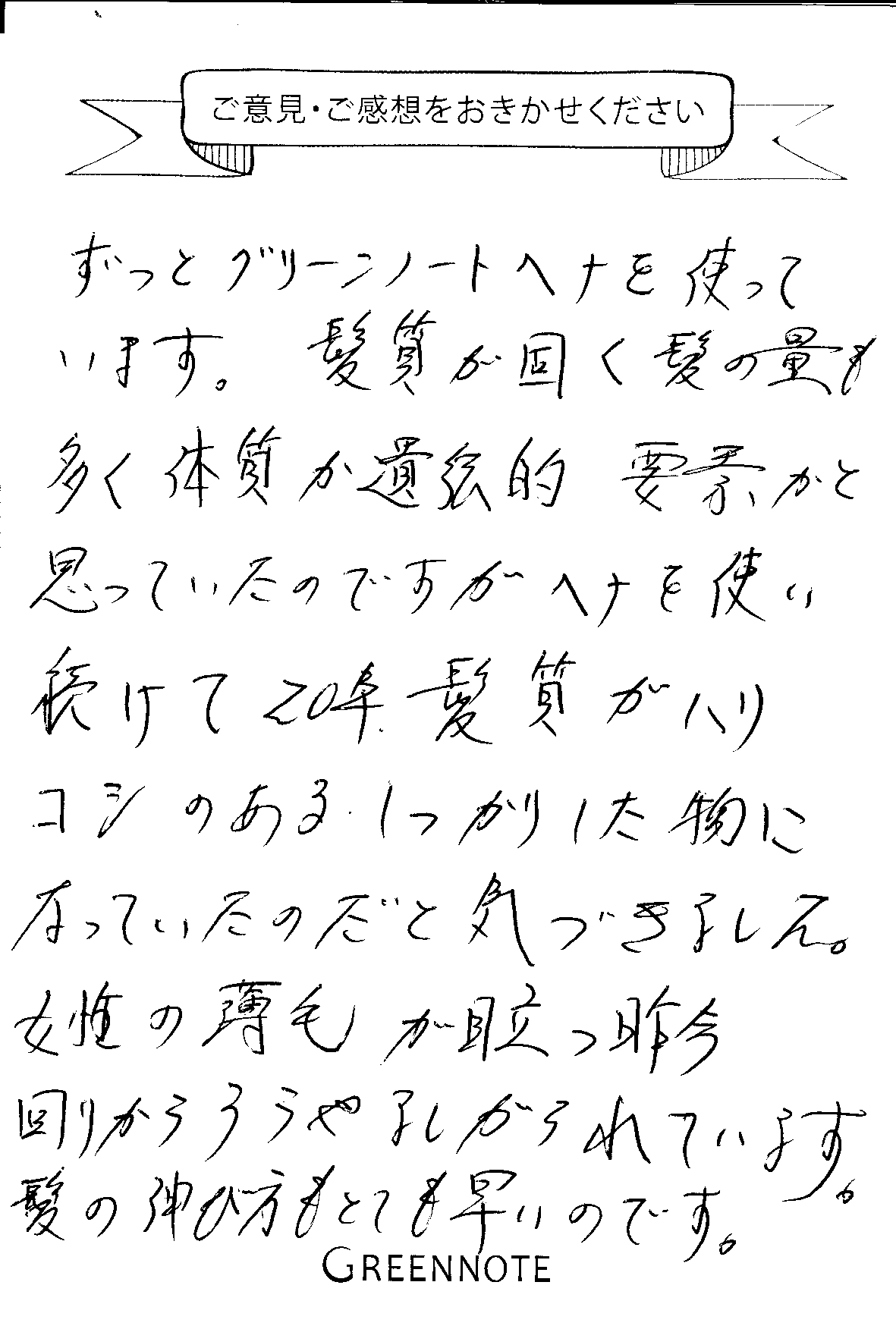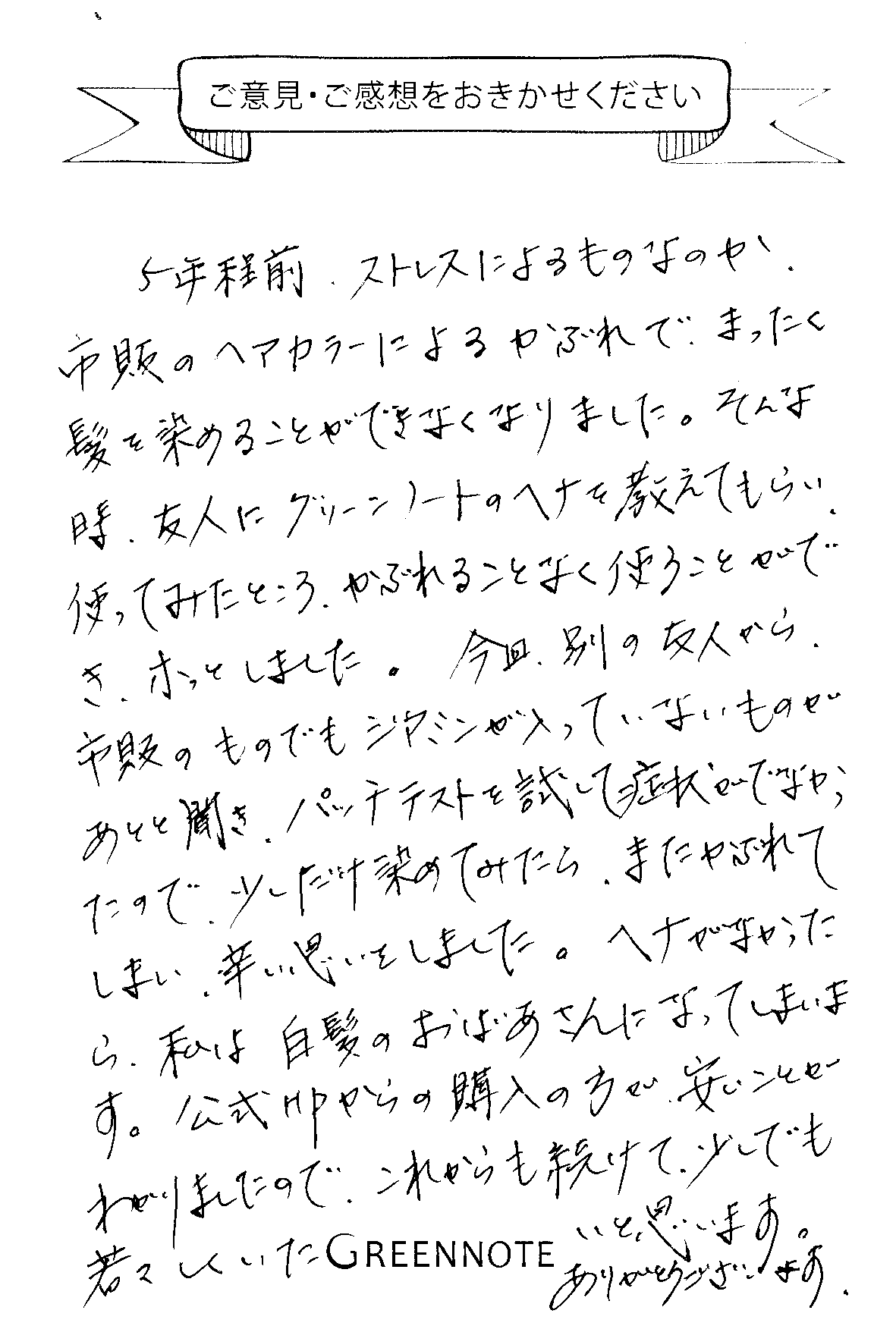 グリーンノートヘナを使った方たちのお声を紹介します。良かったお声も、ここは残念というお声も、どれも大切なお声として、わたしたちスタッフの励みと課題になっています。これから使いたいと思っている方は、ぜひ参考になさってください。