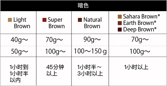 ※特别是第一次发质比较硬、比较粗的发质,染发粉量要比表示的量多・放置时间要长。