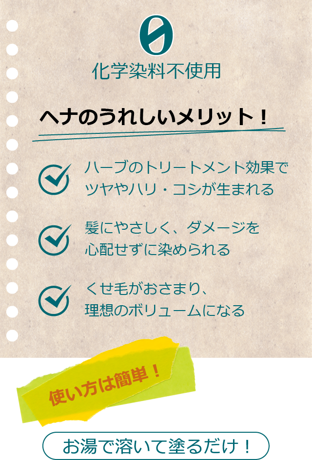 天然ハーブの染色力は、疲れた頭皮や髪をやさしく癒します。