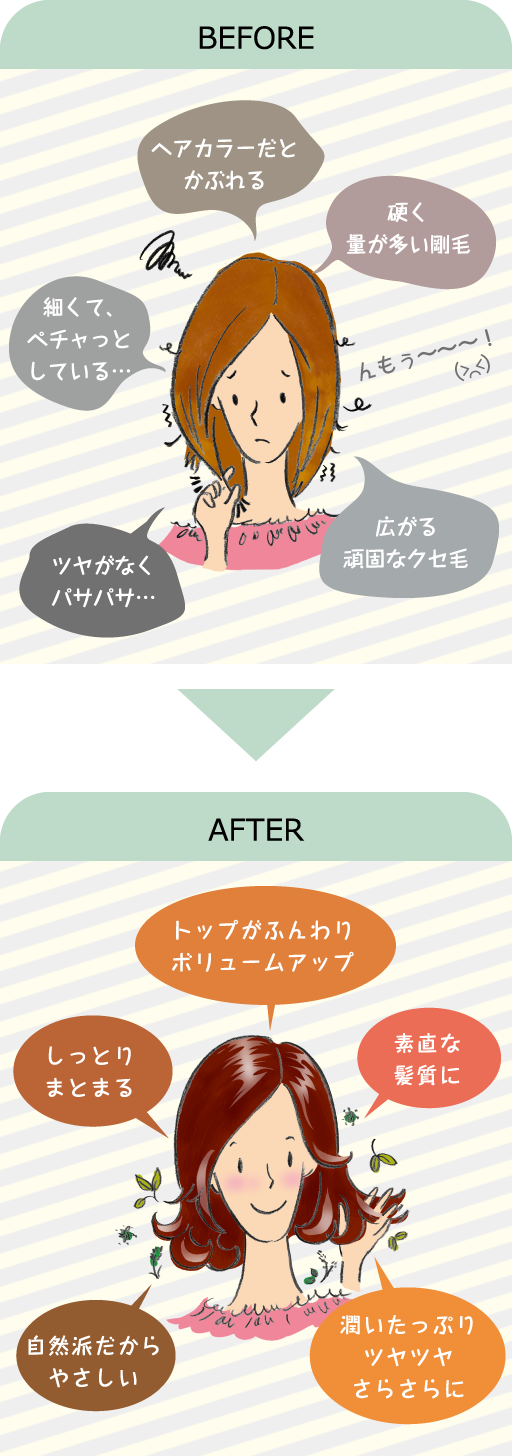 グリーンノートヘナを使い続ける事によって、それまで持っていた髪の悩みに応じて実感する嬉しい変化があります。