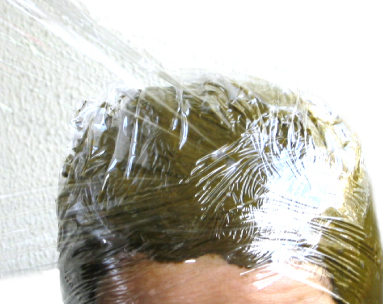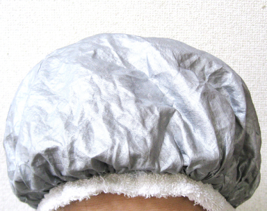 液だれ防止にタオルをきつめに巻いてシャワーキャップをかぶります。
