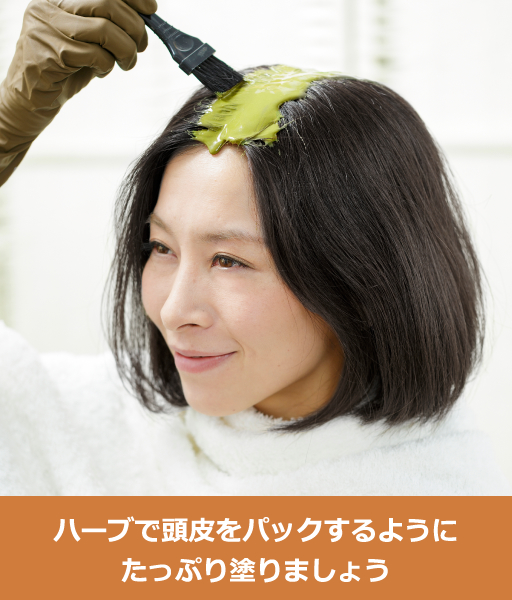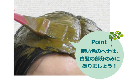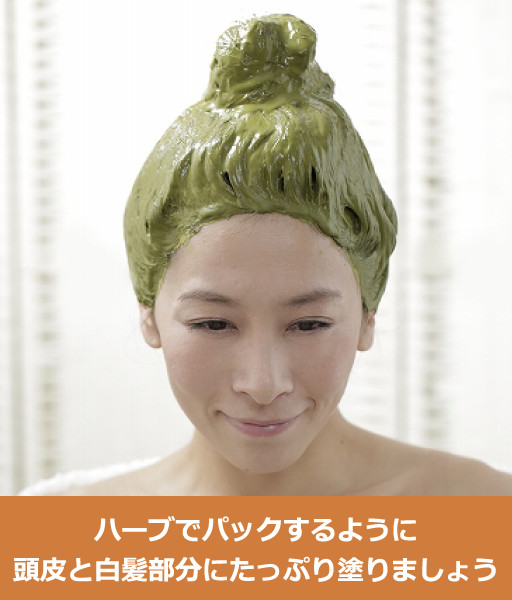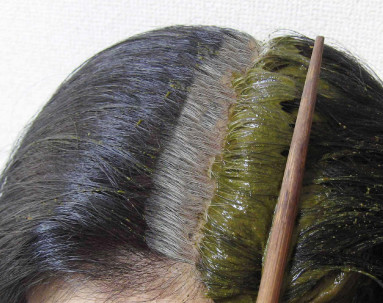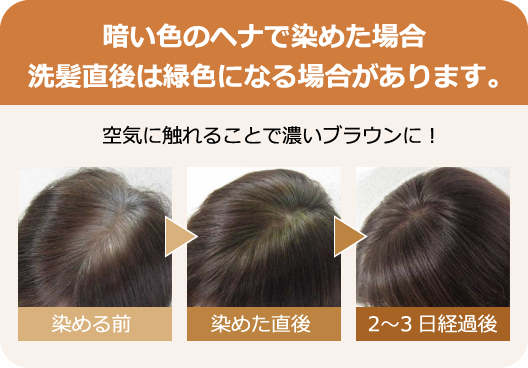 ブラウン系のヘナの場合、染めた直後は緑色に発色する場合があります。これは草木染め特有のプロセスで、このあと緑色に発色した部分は、空気に触れることにより、だんだん目的の濃いブラウンに変化します。大切なお出かけの前などは、日にちに余裕をもって染めましょう。