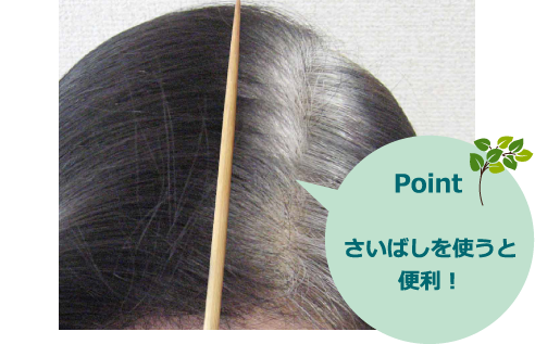 菜箸を使い、まっすぐに分け目をとり、しっかりと白髪を露出させます。