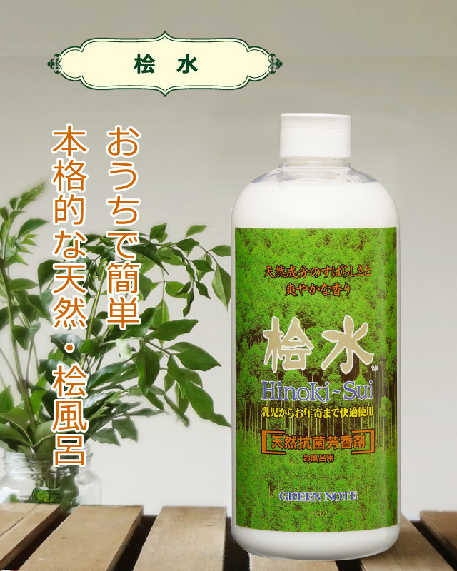 森の知恵から生まれた桧水は、天然ヒノキのさわやかな香りで、あなたのストレスを癒します。
