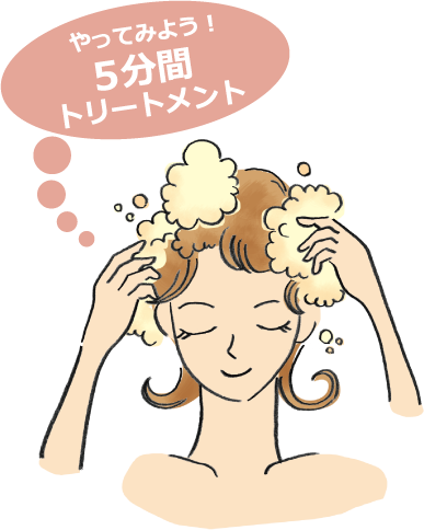 天然アミノ酸や植物抽出エキスをしっかりと髪に浸透させるため、5分程度しっかりと髪になじませてください。特に傷んでいる部分に泡をもみこむと効果的です。