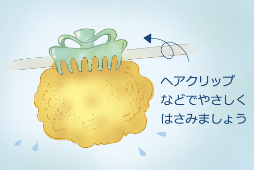 乾燥させる際は、ヘアクリップなどの大きめの留め具などをご使用いただき、陰干しにしてください。