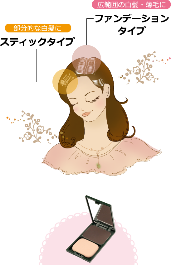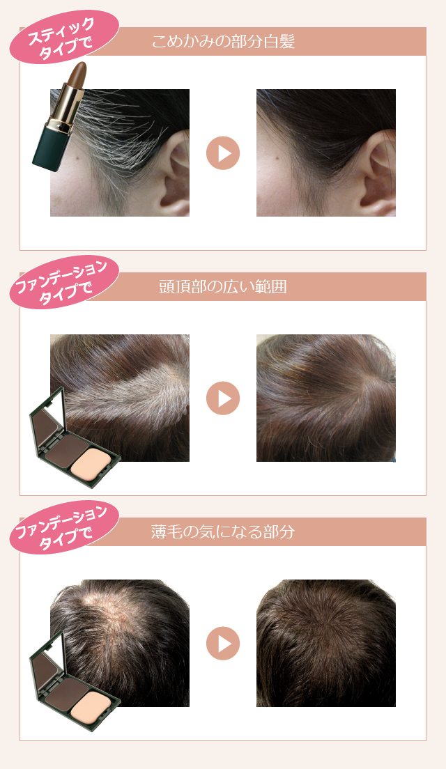 ファンデーションタイプはベタベタせずに広範囲の白髪や薄毛を自然にカバー。重ね塗りで濃淡を調整できます。